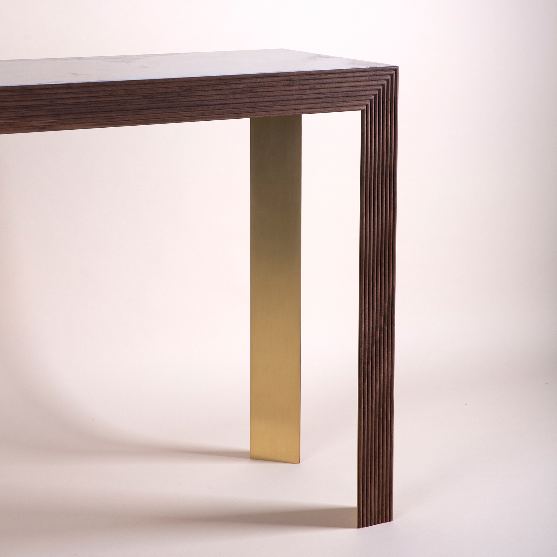 Made of solid Canaletto walnut wood, “grissinato” with applications in brass satin, top with